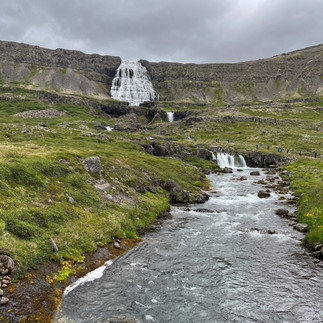 During the morning we disembarked via zodiac to visit the Dynjandi Waterfall. Dynjandisvogur which translates to "Thunderering waterfall". It cascades down a 100 meters/328 foot descent, following the natural contours of the basalt underneath.